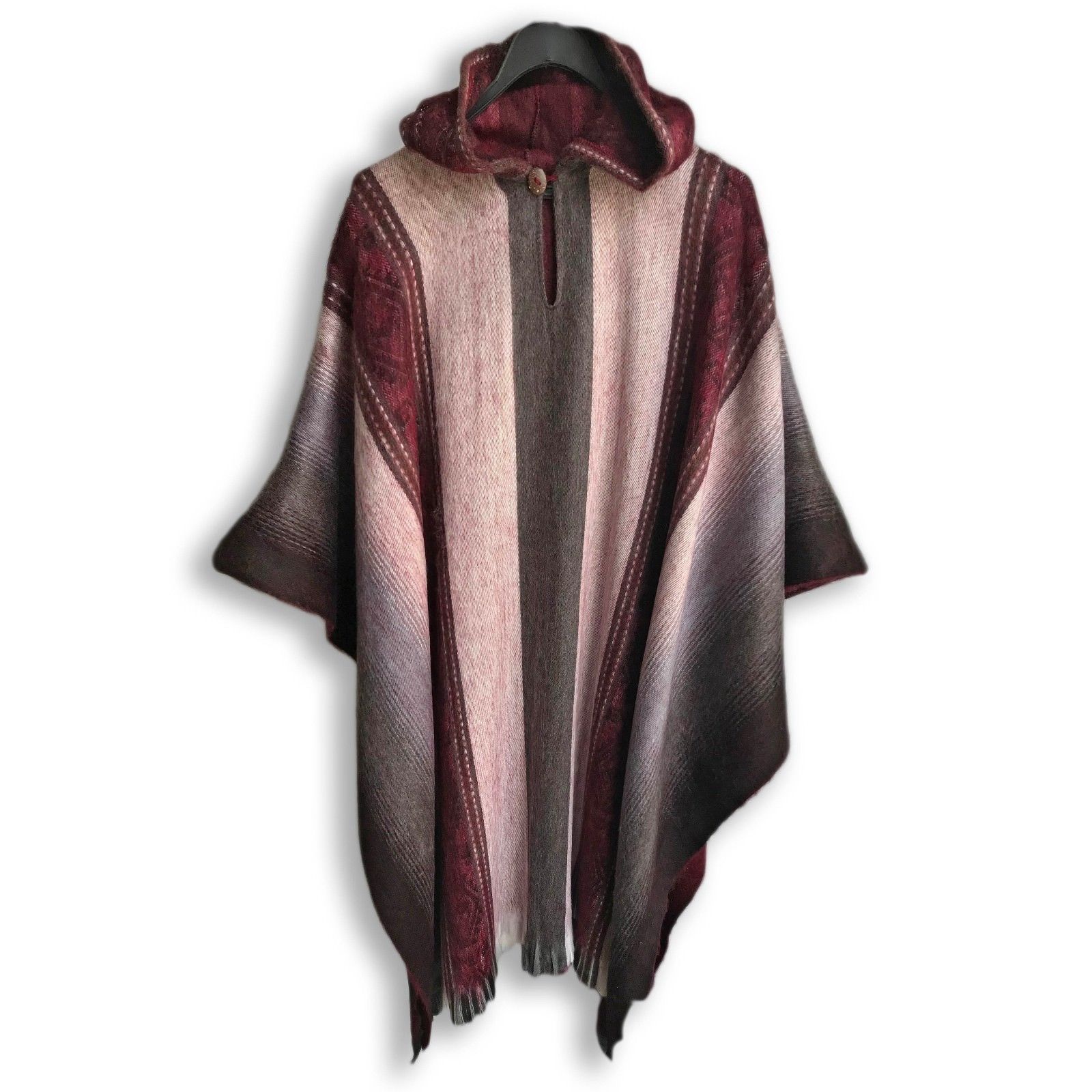 Incan patterns in rich Bordeaux Reds with a subtle Rose and grey gives this poncho a warm, rich look. A comfortable, attractive item you'll enjoy for a lifetime.
