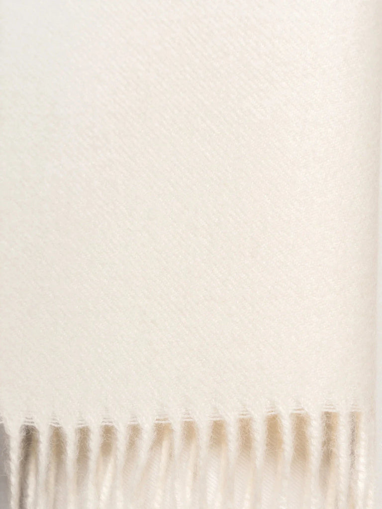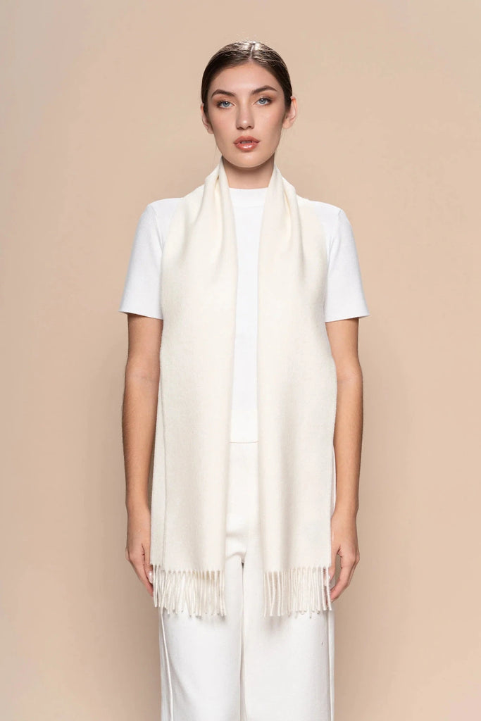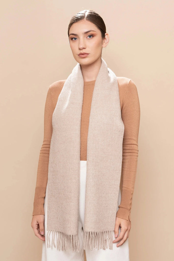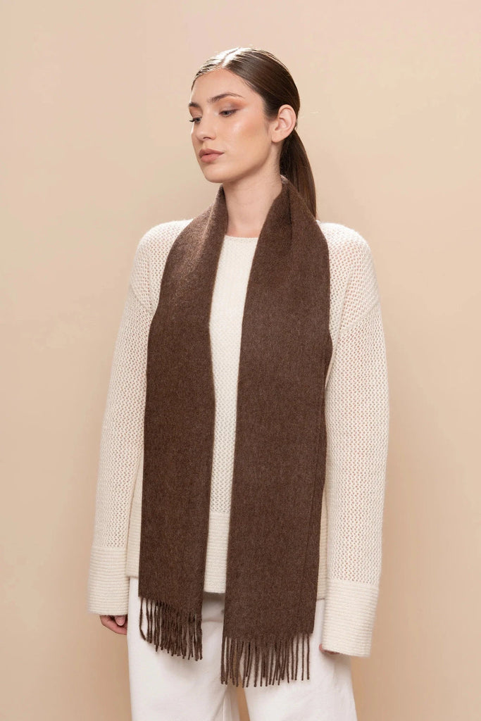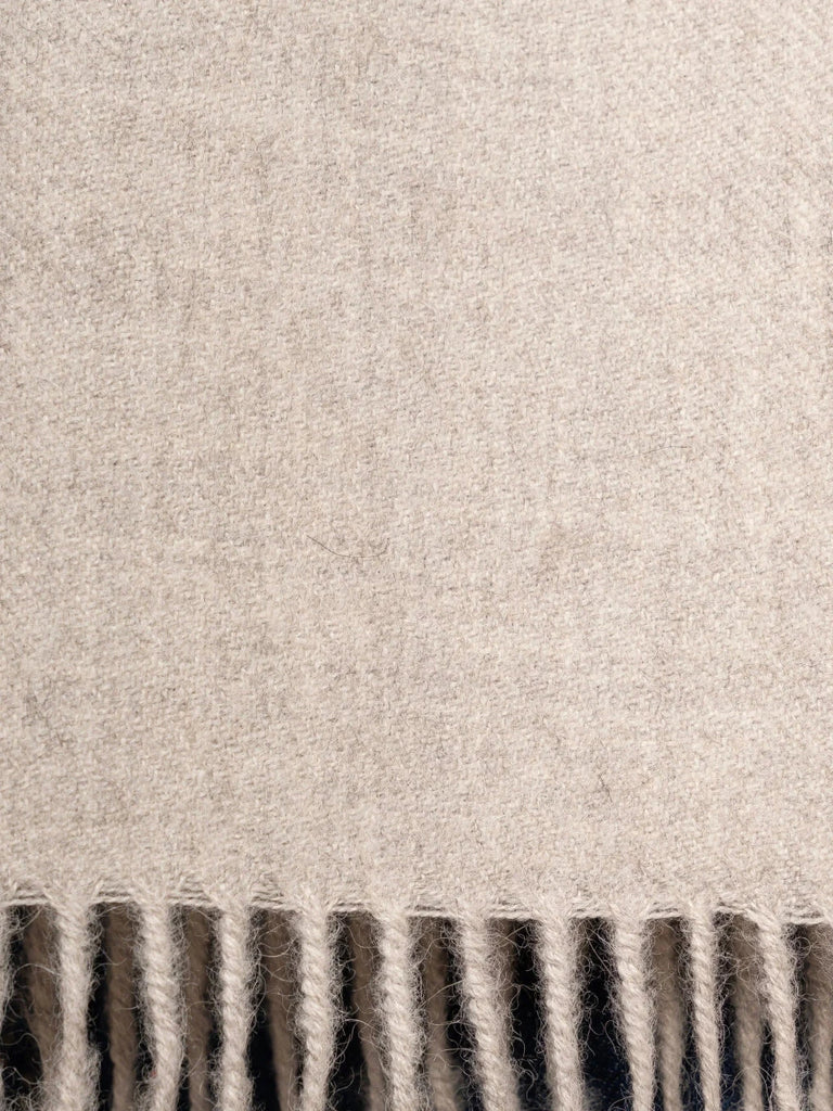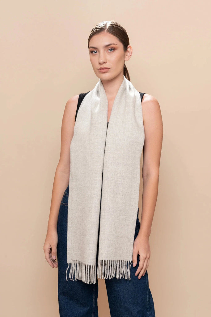 Crafted from luxuriously soft 100% baby alpaca, this undyed natural scarf embodies understated elegance and sustainable style. The soft gently brushed texture provides warmth and comfort, while the artfully twisted fringes add refined detail.